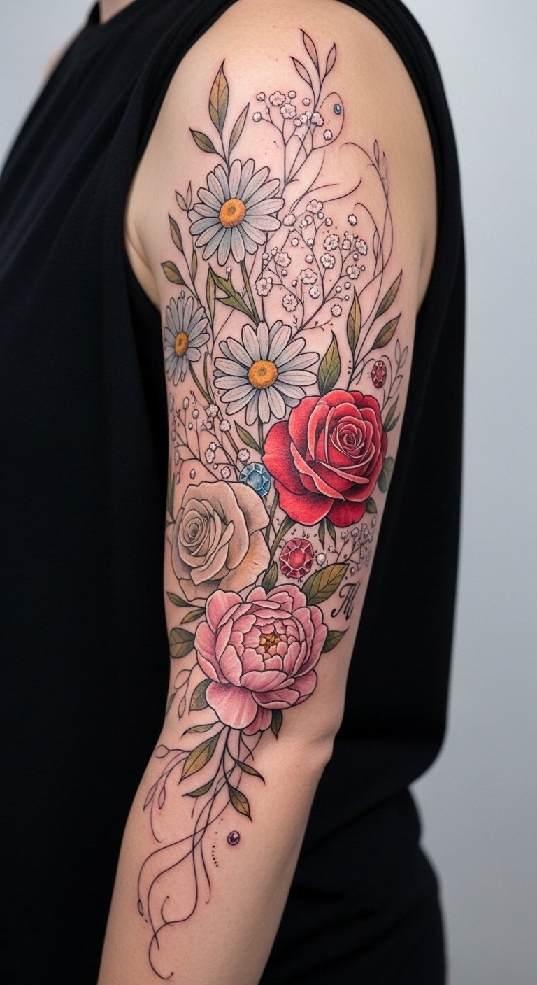 This design pairs symbolic flowers for personal milestones—daisies for innocence, roses for passion, peonies for prosperity—evoking nostalgia, resilience, and joy; place the half-sleeve where it can flow with muscle contours (shoulder to mid-forearm) so the composition reads dynamically in motion and leaves room for future additions.