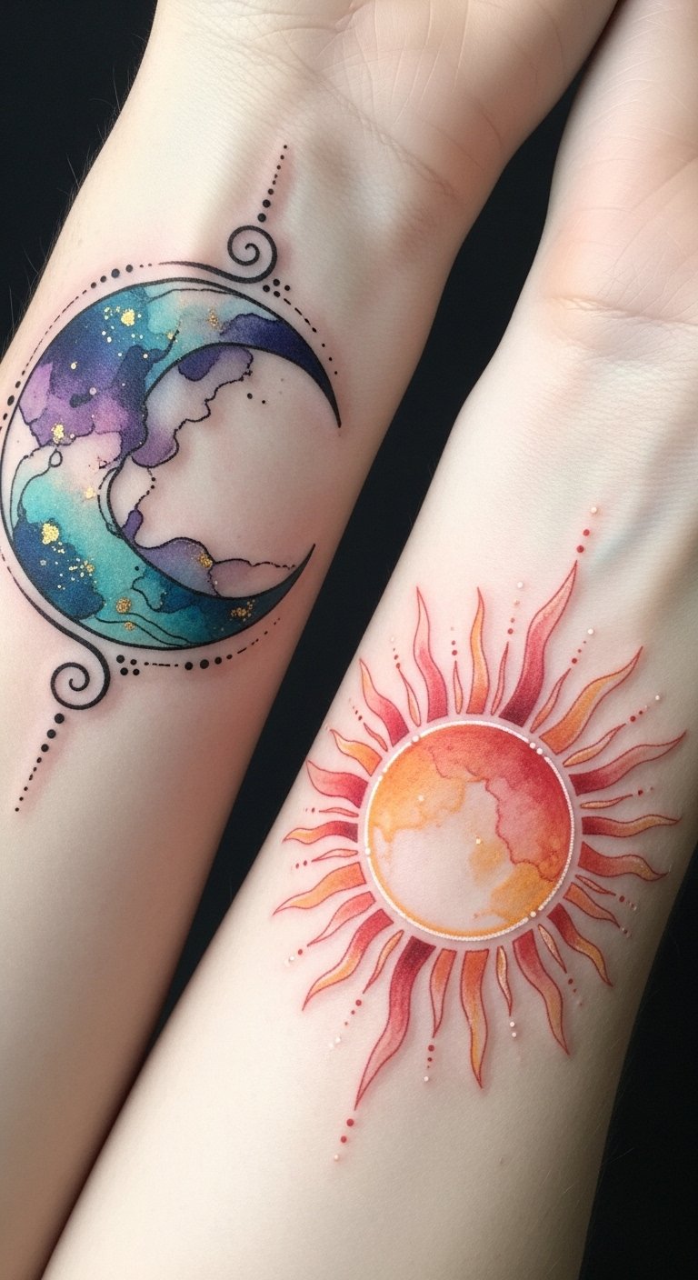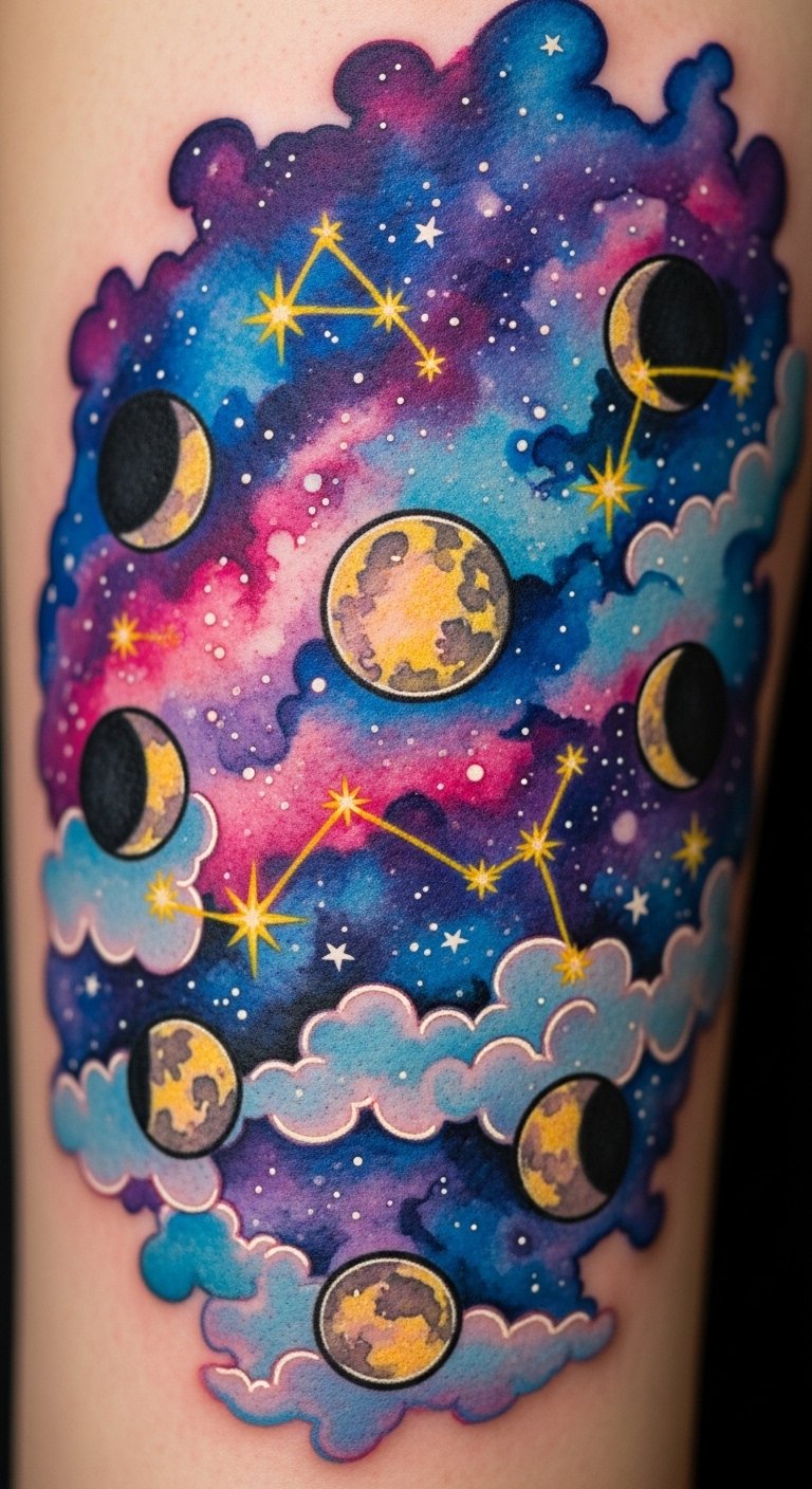 A flowing watercolor design centered on a crescent moon surrounded by scattered stars and faint constellation lines, blending indigo, teal, magenta, and gold washes into soft cosmic clouds; fine white highlights for starlight, delicate dotwork for depth, sized to arc along the forearm or shoulder blade.