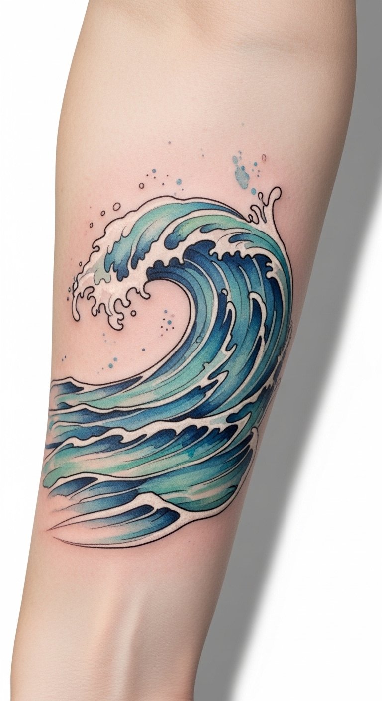 Ideal placement is the inner forearm or wrist where the wave’s flow can follow the natural line of the arm, allowing movement when you gesture and preserving the delicate watercolor details while remaining personal and visible.