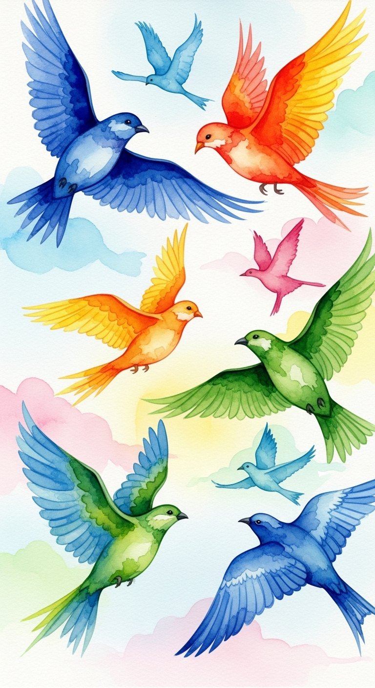 This design pairs luminous watercolor washes and loose brushstrokes to convey movement and joy: vibrant blues, oranges, and pinks trail from a flock of stylized birds in mid-flight, their forms suggested rather than rigidly outlined to emphasize freedom.