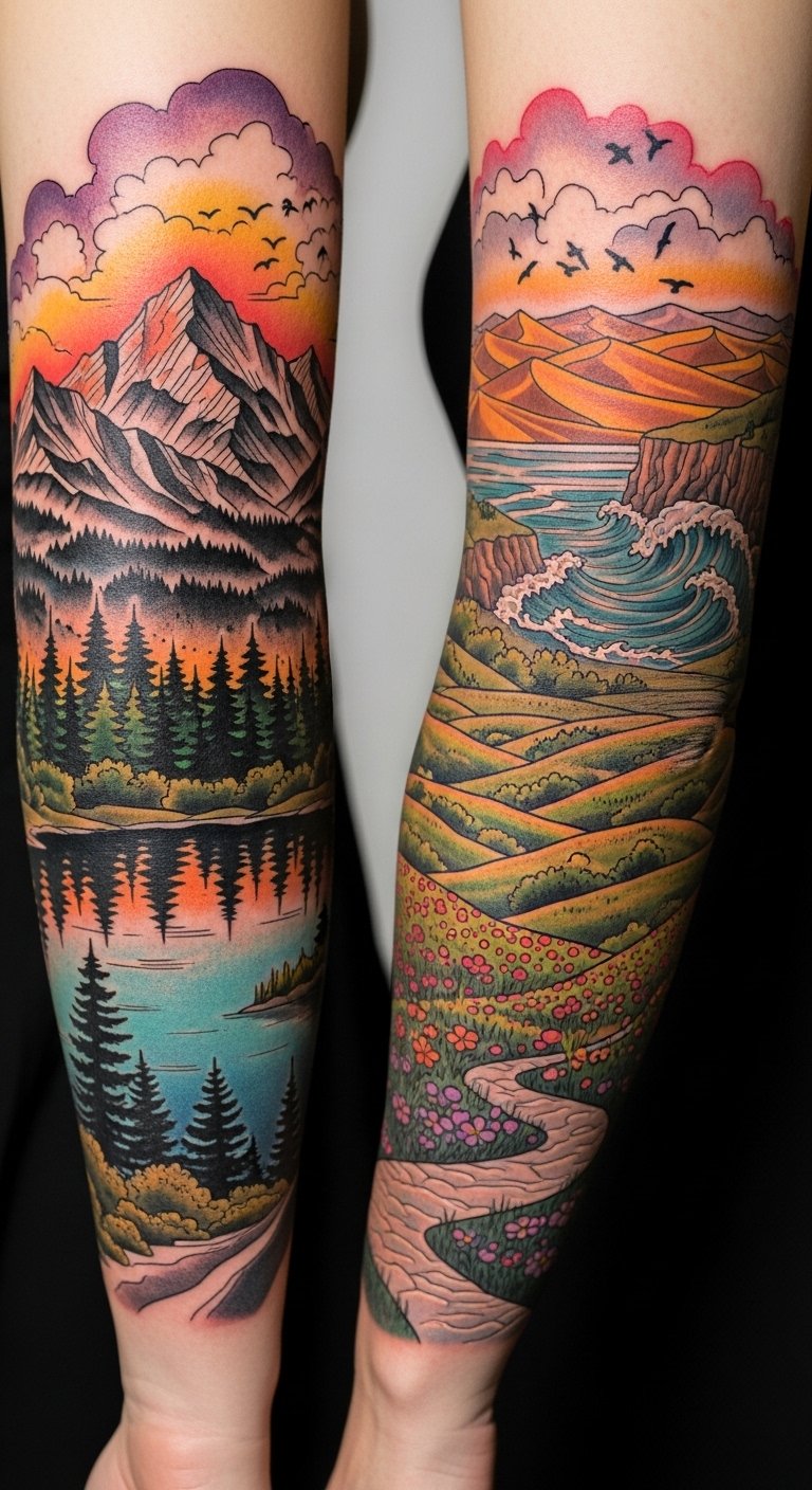 From desert landscapes to coastal views, each tattoo captures the essence of wild terrain and lush greenery, inviting freedom and adventure into your life.