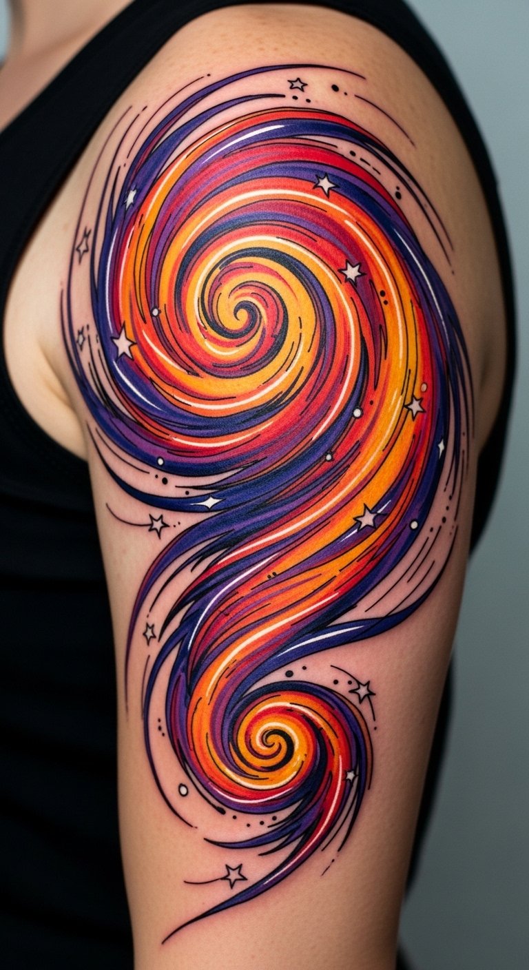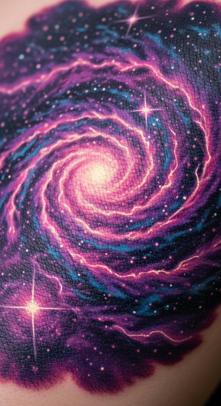 As you gaze into the cosmos, it’s impossible not to feel a sense of wonder, which is exactly what cosmic pattern tattoos aim to capture. Imagine vibrant galactic swirls dancing across your skin, embodying the universe’s endless beauty. Each stroke blends colors in cosmic harmony, inviting you to express your adventurous spirit. These tattoos become a canvas of freedom, celebrating your unique connection to the stars. This design symbolizes exploration, personal growth, and the infinite possibilities within and beyond oneself; spiritually uplifting colors evoke awe and serenity while dynamic swirls convey motion and curiosity. Ideal placements include the upper arm sleeve or shoulder blade for larger, flowing compositions, the forearm for a visible daily reminder, or the ribcage and side for a more intimate, expansive piece that follows body contours.