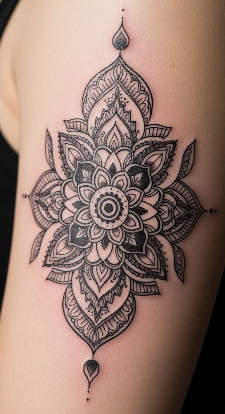 The symbolism emphasizes inner exploration and harmonious balance, evoking calm introspection and spiritual freedom; placement on the chest or between the shoulder blades allows the design to align with the heart and spine, making it feel intimate and grounded while visible enough to communicate depth and personal journey.