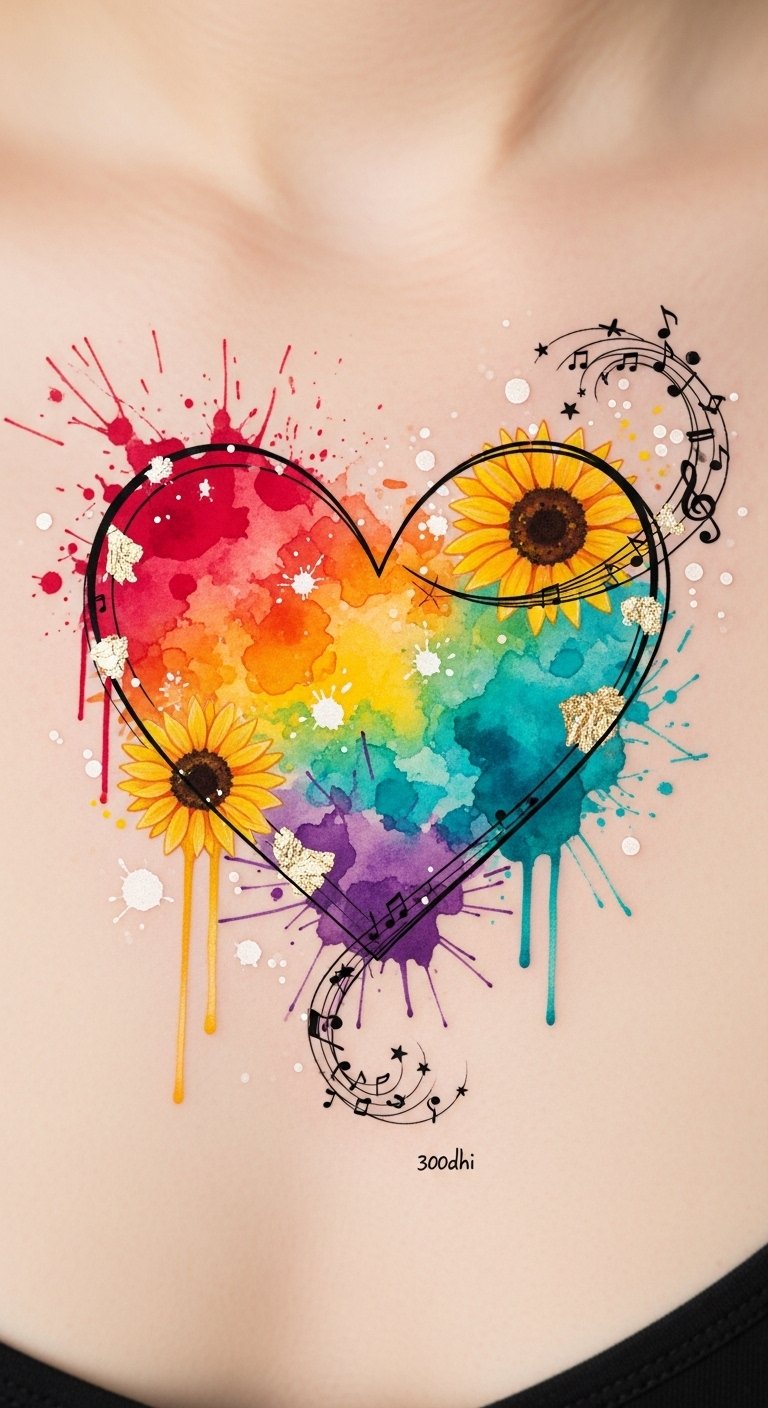 The watercolor heart symbolizes the fluidity of emotion and the layered nature of personal history; red and orange evoke passionate intensity, yellow brings warmth and optimism, while teal and violet suggest introspection and spiritual depth.