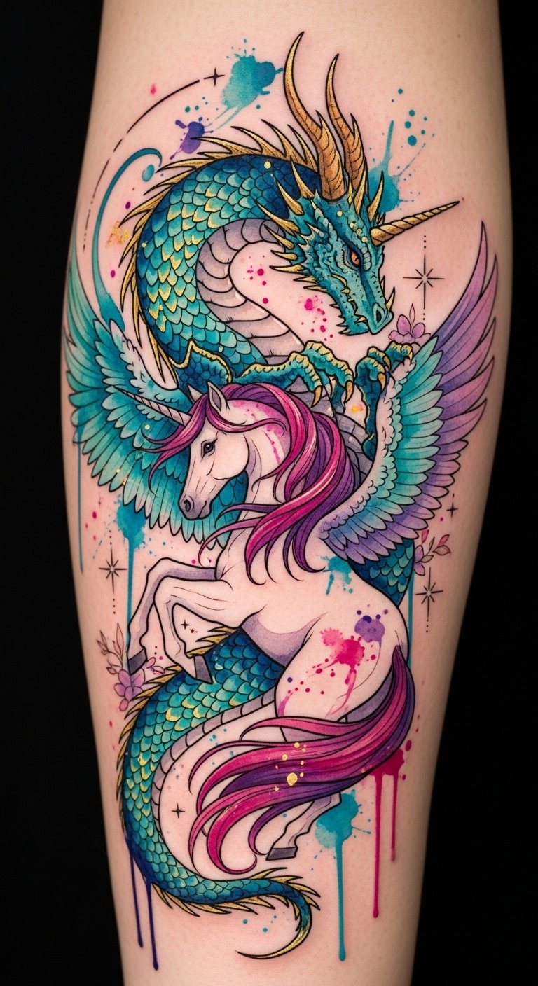 This design symbolizes the balance of power and purity—the dragon embodying courage and transformation, the unicorn representing innocence and hope—evoking wonder, liberation, and inner strength; ideal placement is the forearm, shoulder, or ribcage where the flowing composition can wrap and move with the body, enhancing emotional resonance and visual movement.