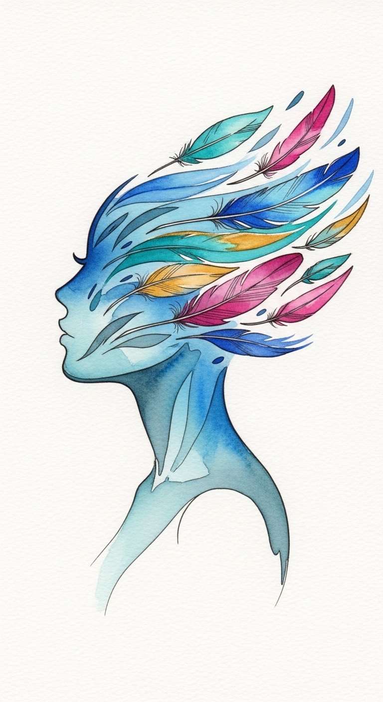 Flowing seamlessly from the emotive expressions of abstract portraits, elegant feathers embody grace and color in motion, capturing the essence of freedom and beauty.