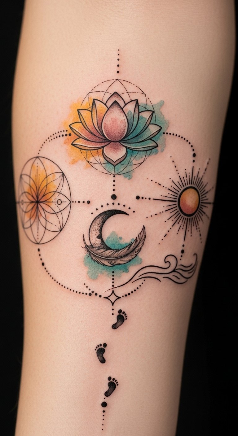 Embrace these vibrant tattoos, letting them tell your unique story and celebrate your quest for freedom and understanding. The composition’s symbolism blends growth (lotus), intuition (moon and feather), vitality (sun), and life’s journey (footprints and waves), evoking calm resilience and hopeful reflection; ideal placement is along the forearm where the band naturally follows the arm’s curve, visible for personal affirmation yet easily covered, emitting gentle emotion through muted watercolor tones and fine-line detail.