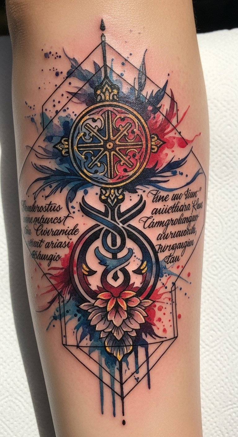 These tattoos are more than mere ink; they’re vibrant storytelling, allowing you to showcase your roots with passion and creativity, embracing the freedom of self-expression. The design uses color and fluidity to evoke memory and belonging—indigo for depth and lineage, crimson for passion and resilience, gold for celebration—while the intertwined elements suggest continuity between past and present;
