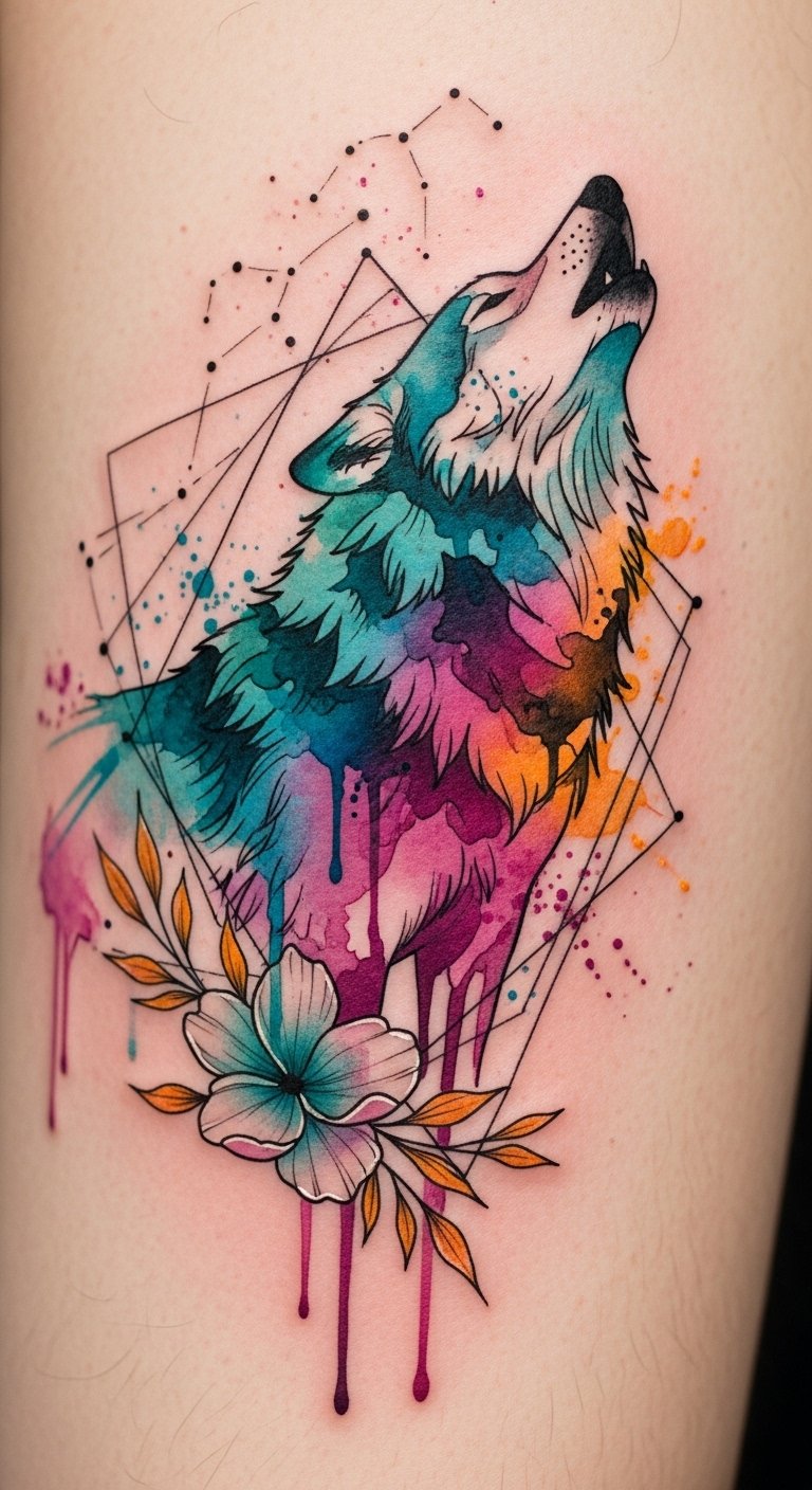 This vibrant watercolor tattoo captures your nature connection, celebrating freedom and individuality. Let your chosen totem guide you, reminding you of the wild spirit within. The design emphasizes personal symbolism through color and motion — teal for calm intuition, magenta for passion, amber for vitality — while the constellation dots and geometric lines suggest destiny and balance; emotionally it evokes empowerment and belonging.