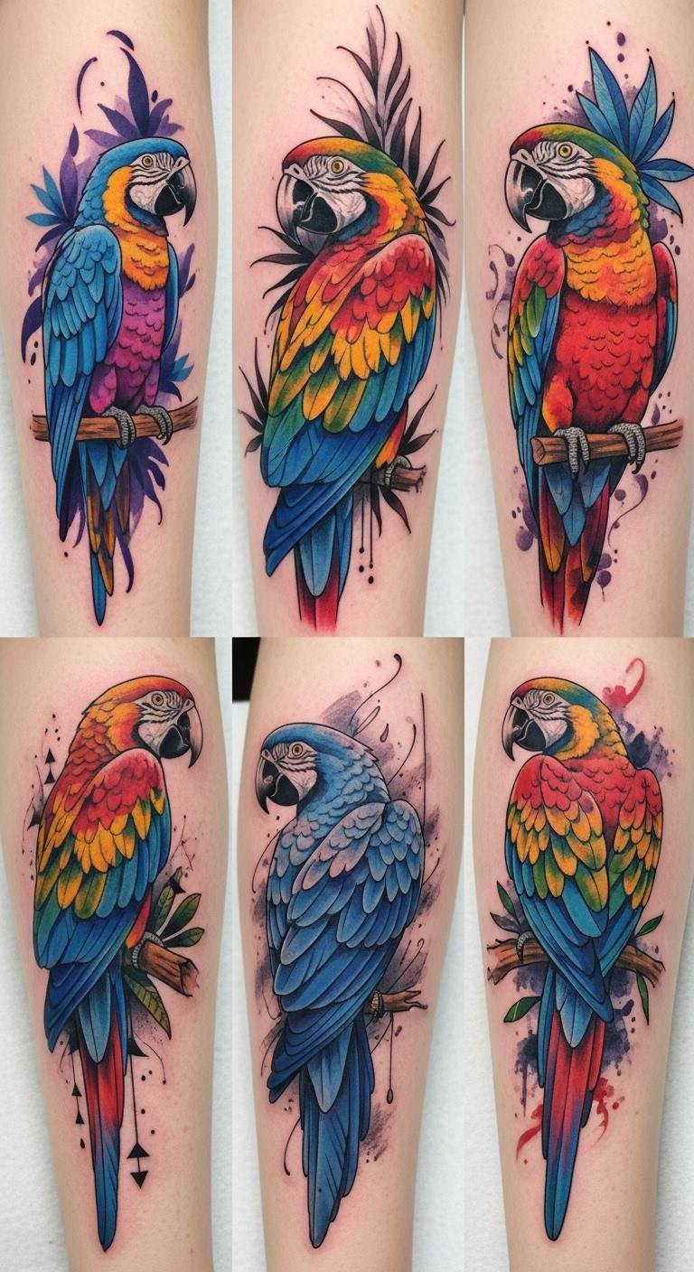 A vibrant parrot tattoo concept uses bold watercolor splashes and crisp geometric linework to celebrate freedom, joy, and the lush energy of the tropics; placement options include the upper arm or shoulder for a dynamic wraparound feel, the ribcage for a more intimate statement, or the thigh for a larger, detailed piece.