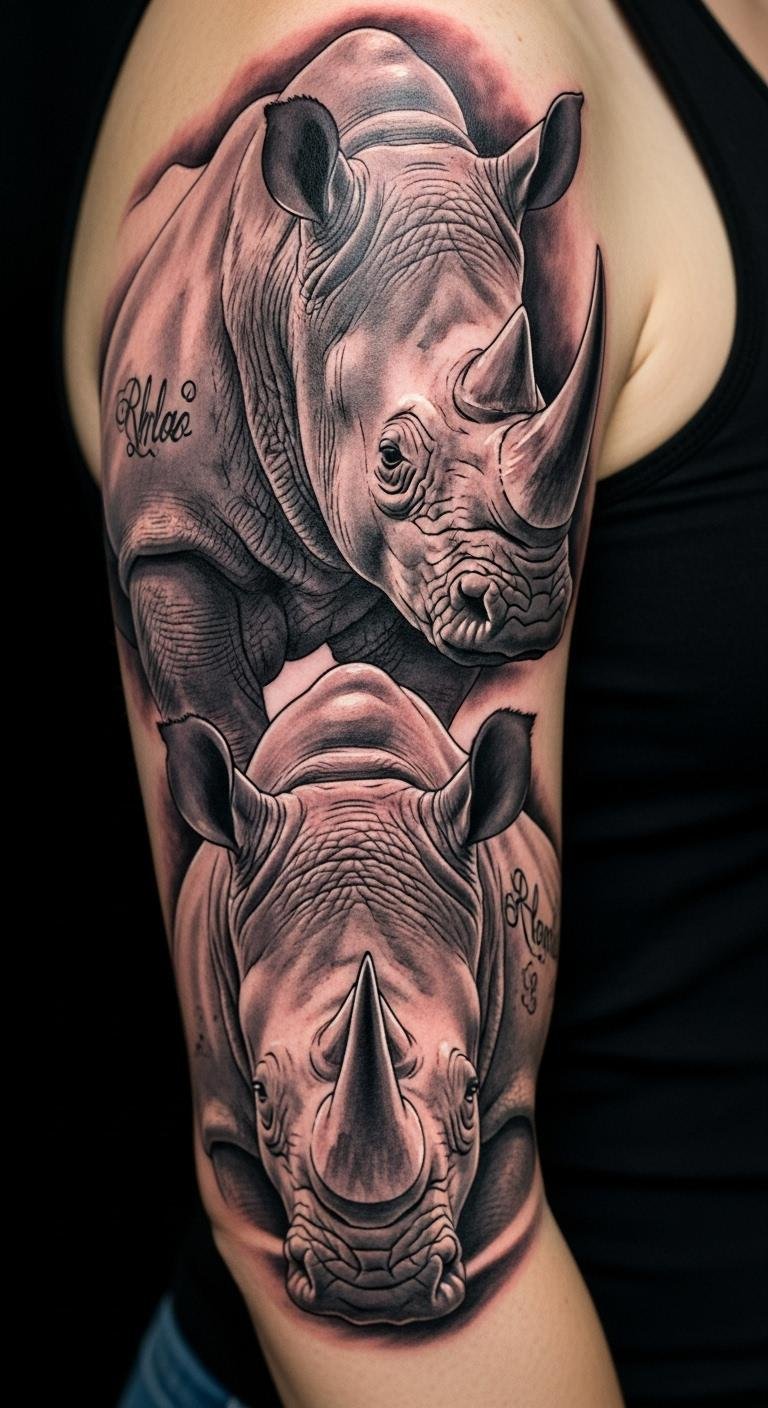 This design anchors a bold, realistic rhino head with textured skin and a slightly turned gaze, surrounded by subtle botanical elements and a faint, stylized map of Africa in the background; use high-contrast black and gray with soft white highlights, fine-line detailing for skin folds and horn striations, and negative space to form the map and foliage—ideal for upper arm, chest, or back where the composition can flow with muscle contours. The imagery conveys resilience and guardianship, evoking quiet strength and a protective stance for conservation; placed over the heart or shoulder it reads as a personal vow to protect wild beauty, while on the back it becomes a larger statement about collective responsibility and freedom.