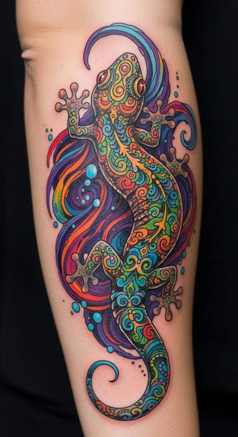 As a tattoo concept, place the swirling, colorful gecko along the outer forearm or shoulder blade so its tail curves naturally with the body’s lines; the design emphasizes adaptability and regeneration through layered scales that transition in hue from cool greens to warm oranges, evoking personal growth and renewed energy. The intricate patterning and flowing form convey freedom and connection with nature, while the placement allows the wearer to reveal or conceal the piece, aligning with evolving identity and emotional transformation.