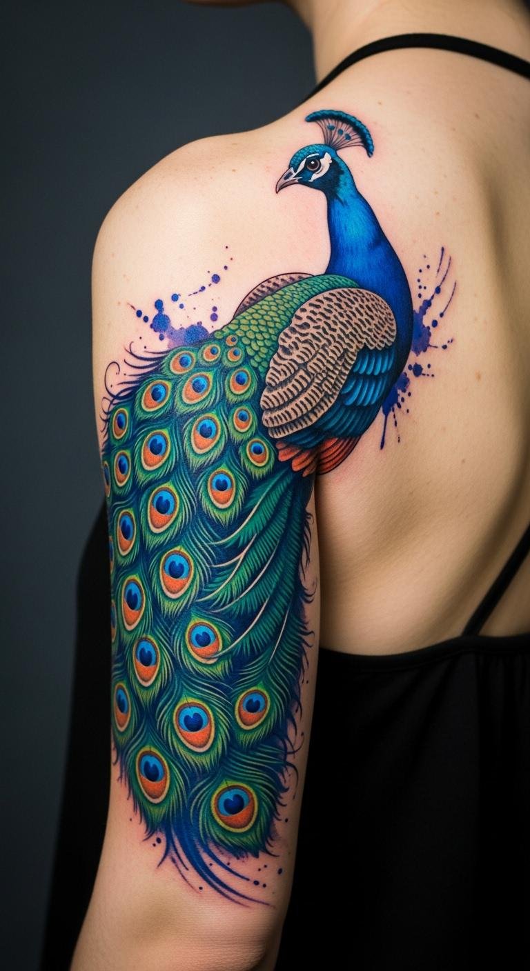 You’ll feel a sense of freedom and individuality, as these stunning designs celebrate your unique spirit, inviting admiration and conversation wherever you go. This design places the fanned tail across the shoulder blade and upper arm to follow natural contours, symbolizing rebirth and self-confidence; the iridescent palette evokes wonder and pride, watercolor accents convey emotional fluidity, and fine dotwork adds a tactile sense of resilience—ideal for someone who wants a bold, expressive piece that reads well from distance and reveals detail up close.