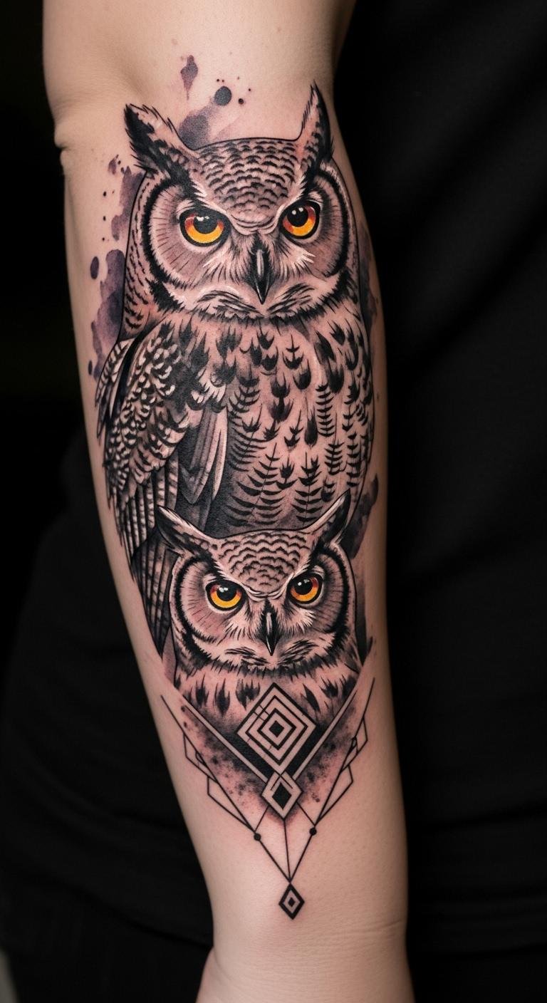 Place this design over the upper back or along the forearm where the owl’s gaze can engage the viewer; use deep indigo and muted gold watercolor washes for nocturnal atmosphere combined with fine black geometric linework for the wings to represent structure and intellect. Symbolically the owl embodies wisdom, the subconscious, and mythic insight—emotionally the tattoo conveys calm vigilance and quiet confidence, a reminder of inner knowledge and freedom in nature while the mixed styles allow personal interpretation between dreamlike intuition and logical clarity.
