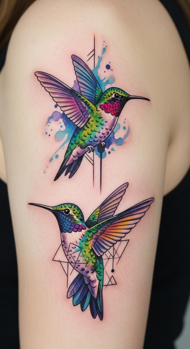 A delicate hummingbird rendered with five distinct vibrant watercolor washes—teal, magenta, gold, emerald, and indigo—blended with fine black geometric linework for wing structure; optional minimalist silhouette overlay and faint splatter accents to suggest motion.