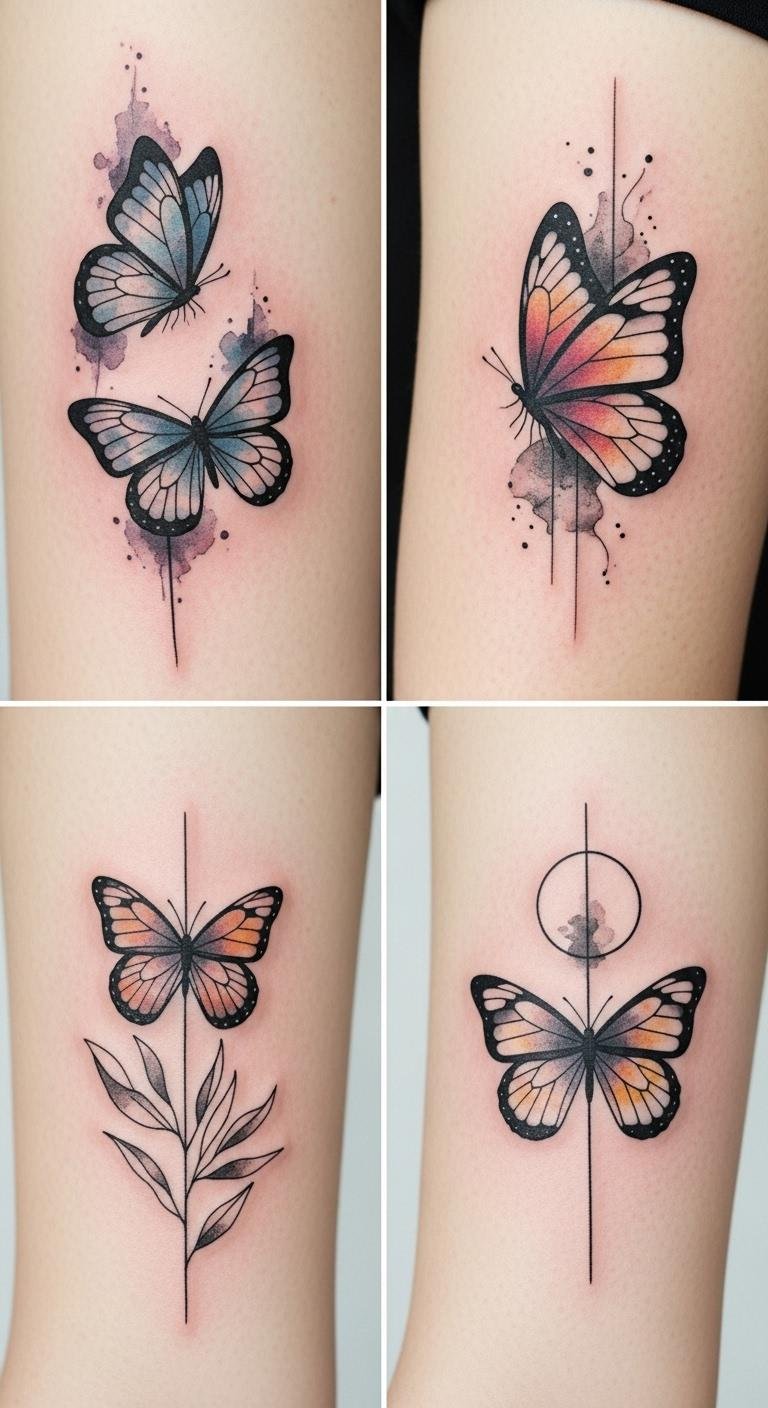 These butterfly tattoo concepts draw on themes of freedom, transformation, and the fragile balance of nature; place a watercolor wing cluster along the shoulder blade or calf for an ethereal, flowing feel that conveys movement and rebirth, or choose a minimalist single butterfly behind the ear or on the inner wrist for a quiet, personal reminder of growth and conservation—colors and placement should evoke lightness and openness, inviting emotional resonance and gentle visibility.