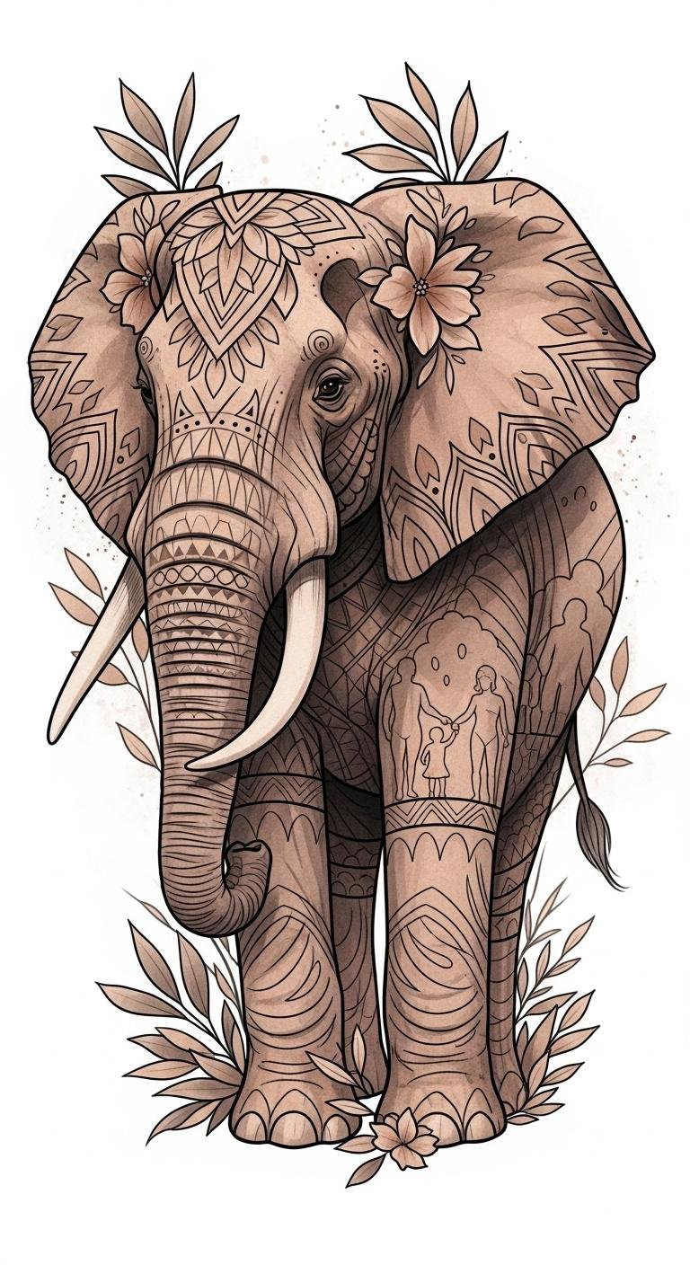 Place this design on the upper arm, shoulder blade, or forearm to emphasize movement and presence; the ornamental patterns and family silhouettes highlight emotional ties and protection, while warm earth tones and fine-line details convey gentle resilience and respectful remembrance.