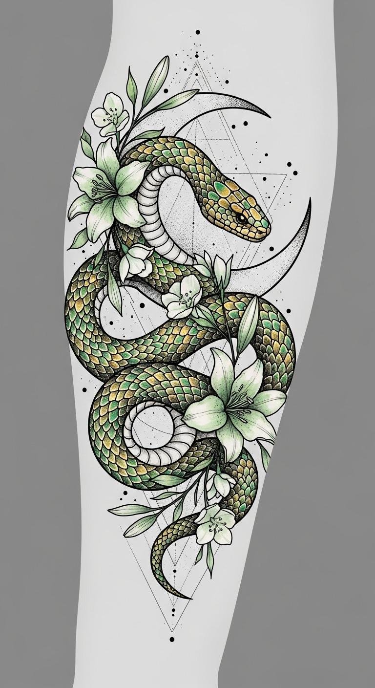 This design blends transformation (the serpent and crescent moon) with delicate beauty (floral accents and watercolor tones) to evoke introspection, renewal, and quiet strength; the fine dotwork and geometric background suggest wisdom and order, while the flowers soften the image to communicate grace and resilience.