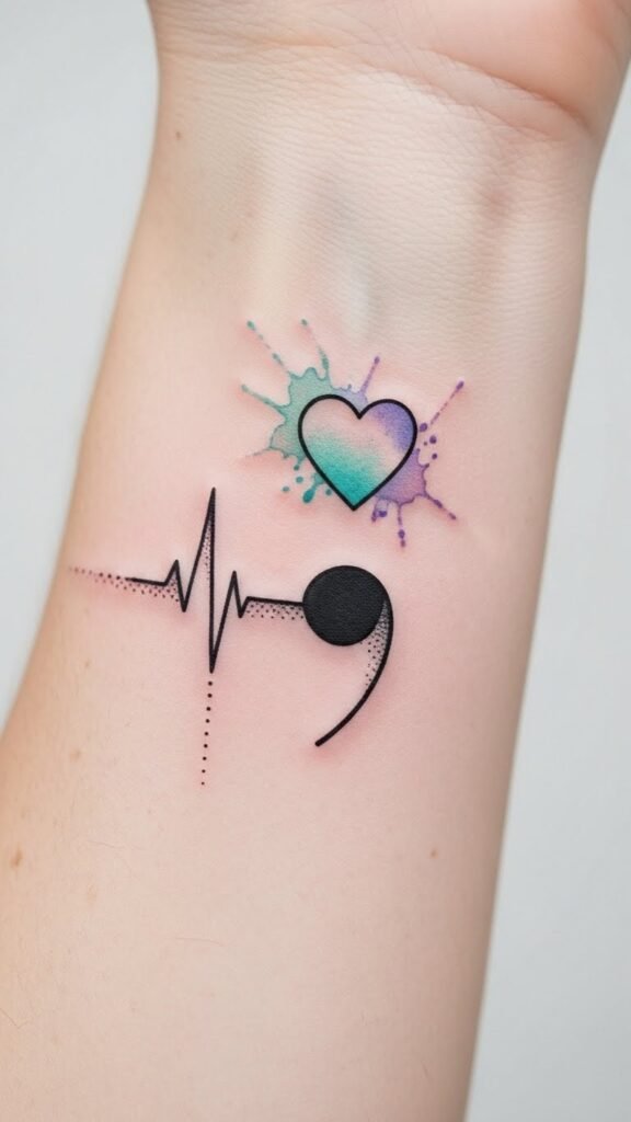 This design blends the literal semicolon with gentle visual cues—the watercolor heart conveys compassion, the heartbeat line represents life and continuity, and the dotted fade suggests ongoing recovery; its small size and placement on the wrist or inner forearm keep it intimate yet visible so the wearer can both draw strength privately and invite conversation publicly.