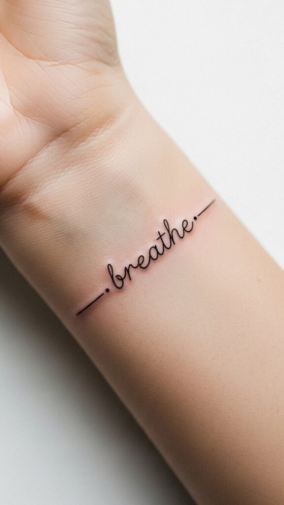 Simplicity often carries profound meaning, and minimalist single-word tattoos encapsulate this beautifully. These striking designs, featuring empowering phrases like “breathe” or “fearless,” speak volumes in their understated elegance. They invite you to embrace freedom and authenticity, reminding you of your strength with every glance. With minimalist design, your wrist becomes a canvas of personal inspiration, empowering you to live boldly and unapologetically. This design symbolizes calm and presence through a single delicate word placed along the inner wrist; its thin serif conveys quiet strength, the tiny dot accent marks a mindful pause, and the realistic placement on natural skin evokes intimacy and daily reassurance each time the wearer glances down.