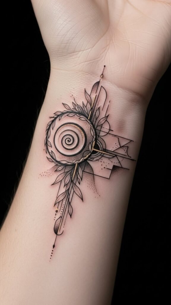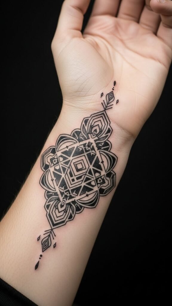 As you explore the world of wrist tattoos, geometric pattern designs stand out for their striking balance and precision. These tattoos, featuring intricate geometric shapes, embody a sense of freedom and individuality. The tattoo symmetry draws the eye, creating a visual rhythm that resonates with your spirit. Each design can empower you, making a bold statement about who you’re and your unique journey. The concept places a compact, symmetrical mandala-like band wrapping the inner wrist, combining sharp polygons and soft circular elements to evoke balance between structure and flow; it symbolizes personal freedom, self-discovery, and confidence, emitting calm yet assertive energy—ideal for daily visibility and intimate placement where its rhythm can be felt with every gesture.