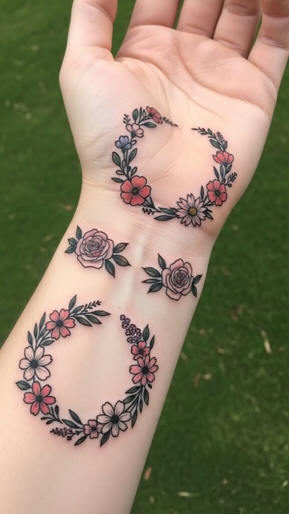 Floral wreath tattoos symbolize cyclical renewal, unity, and personal growth; placing this design around the wrist or forearm evokes protection and continuity, while a shoulder or back placement suggests openness and resilience.