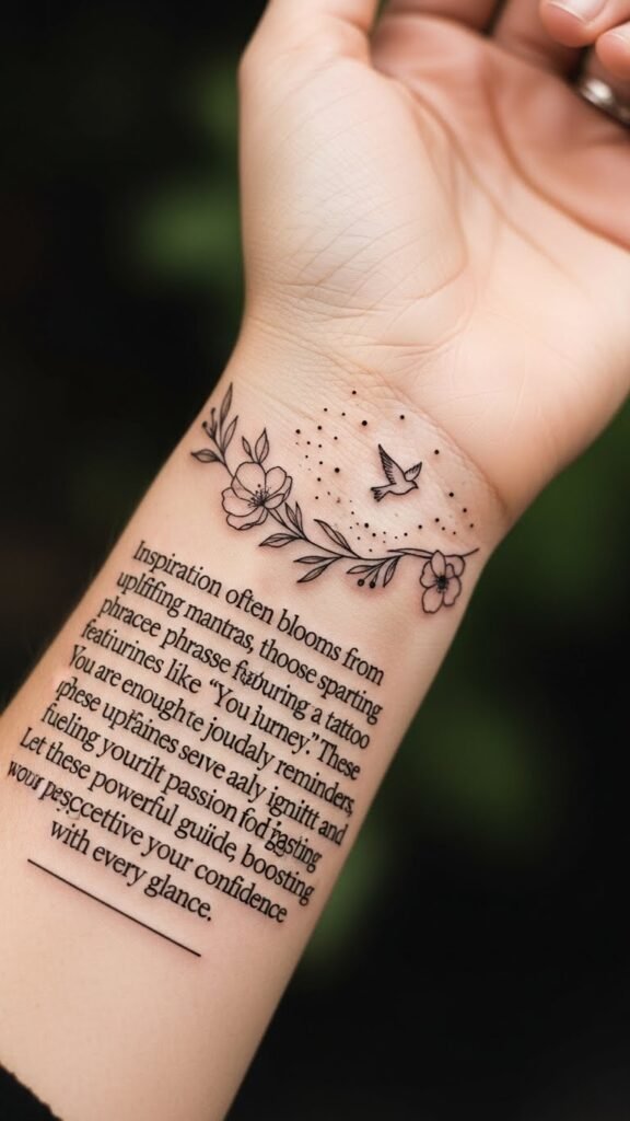 Incorporating the full passage as a wrist tattoo creates a wearable manifesto: the flowing script mimics the cadence of thought, while the surrounding floral linework and bird add breath and movement, symbolizing growth and liberty.