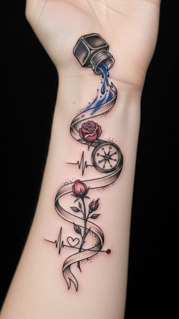 The inkwell symbolizes the source of personal narrative and creative release; the flowing ribbon represents life’s continuity and transformation. The compass marks guidance through change, the rose signifies growth from hardship into renewed beauty, and the heartbeat lines ground the piece in lived experience and resilience.