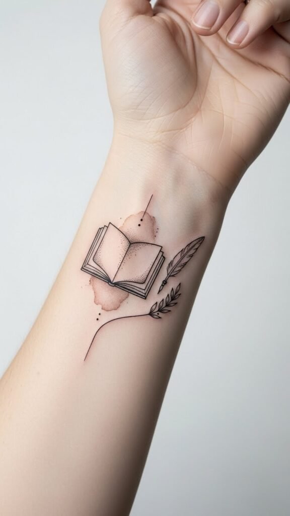Each design tells a story, empowering you to break free from convention and wear your confidence boldly, right on your wrist. This tattoo concept uses the open book for personal narrative and growth, the quill for creativity and voice, and the laurel for achievement and self-respect; placed on the inner wrist where it’s both intimate and visible, it evokes quiet strength, lifelong learning, and gentle defiance.