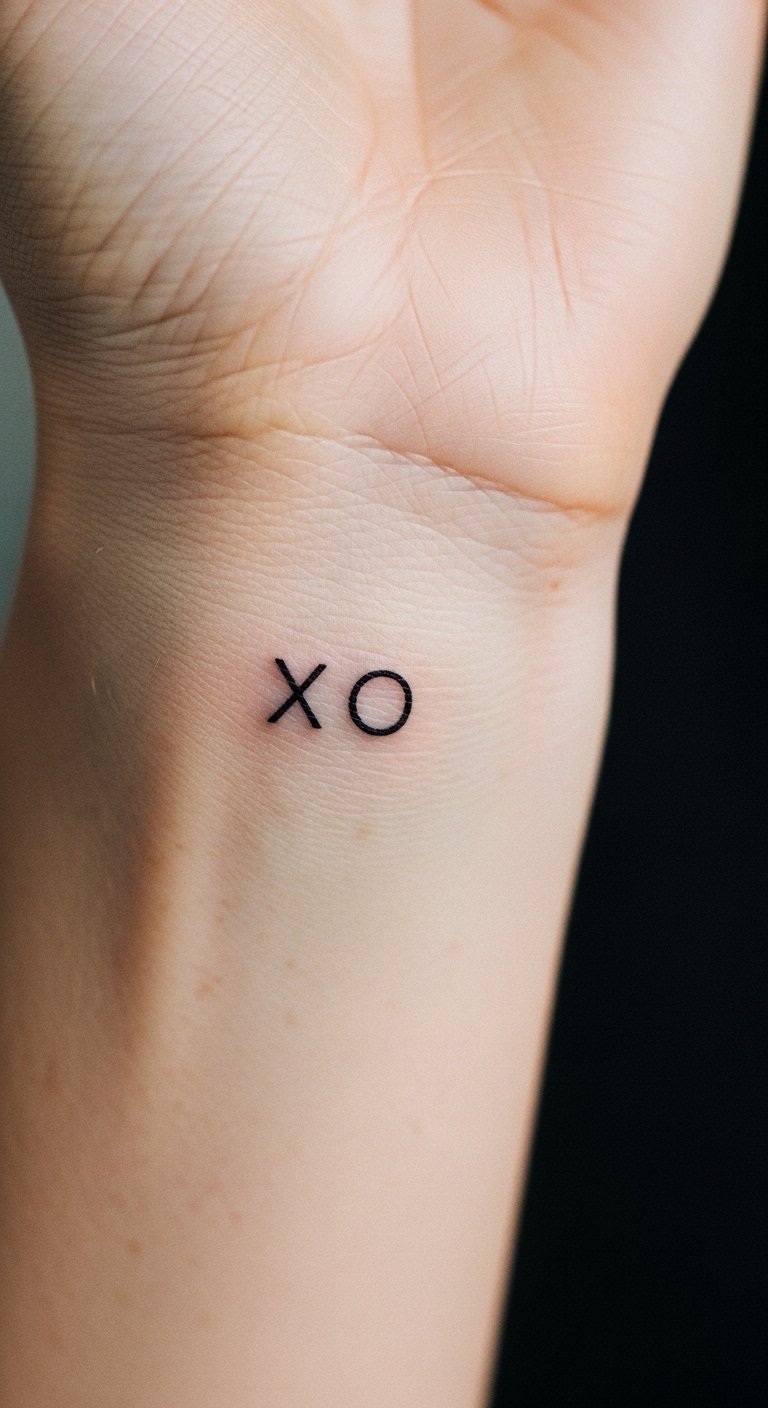 Minimalist XO designs symbolize intimate affection and quiet commitment through pared-down forms—an X of crossed intentions and an O of encompassing warmth—crafted with fine, steady lines for a timeless look. Emotionally they speak of connection, memory, and personal truth, suited for placements that feel private yet visible at will: inner wrist, behind the ear, ribcage, or ankle. Their restrained aesthetic allows the wearer to carry meaning without ostentation, pairing well with other small symbols or standing alone as a subtle declaration of love and selfhood.