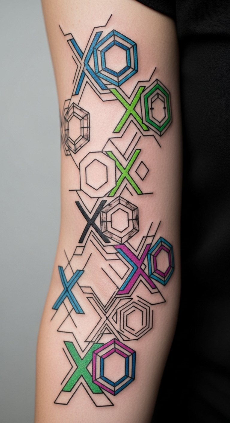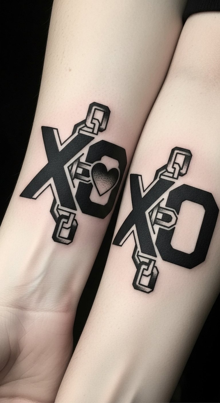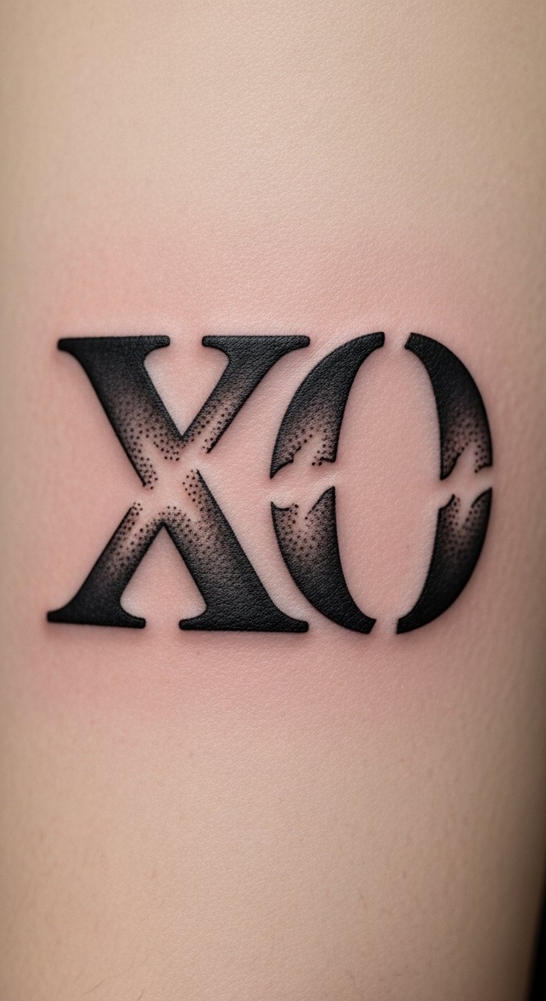 Geometric XO tattoos symbolize the union of affection (X for kisses, O for hugs) translated into precise shapes and balanced forms; their clean lines and mirrored composition convey emotional equilibrium and intentional connection.