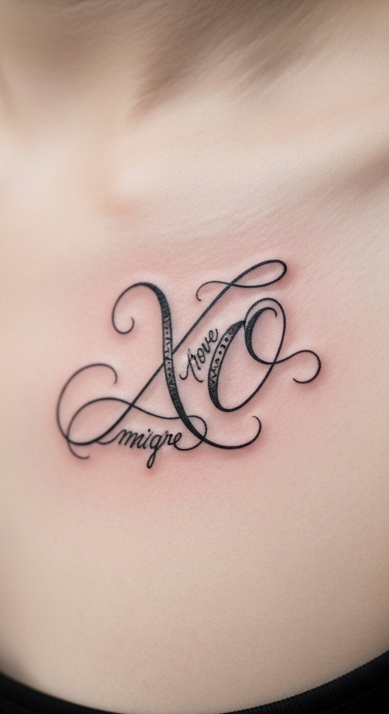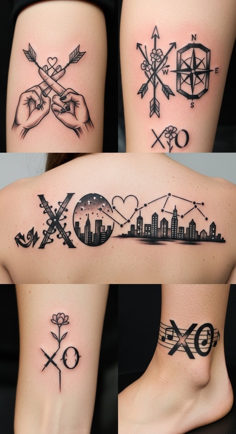 While exploring the world of tattoo art, you’ll discover that multi-design XO combinations offer a unique way to express your personality and emotions. Imagine creative XO placements intertwined with symbols or words that resonate deeply with you. These unique XO styles can transform your ink into a powerful narrative, celebrating love, friendship, and individuality—allowing you to wear your heart boldly on your skin. The design concept pairs delicate XO motifs—some formed from fine script, others from minimalist lines or floral vines—with small accompanying icons (stars, anchors, lock-and-key, or tiny portraits) to encode different relationships and memories; placed along the inner wrist, collarbone, ribcage, or behind the ear, the cluster reads as a personal alphabet of affection, evoking intimacy and resilience while allowing flexible expansion as life and bonds evolve.
