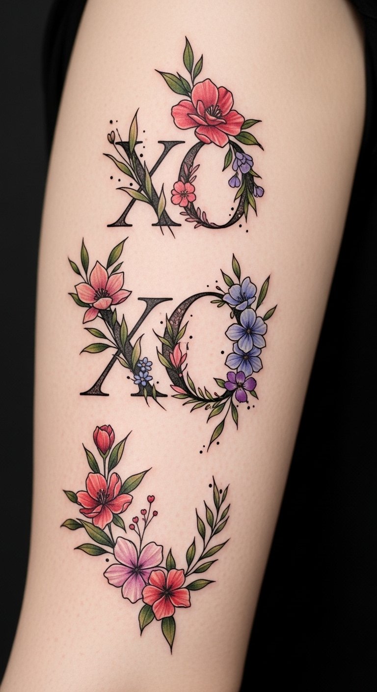 This design pairs the XO motif with a cascade of seasonal flowers—delicate peonies and wildflowers entwined with vine-like filigree—rendered in soft watercolors and fine black linework; intended for the outer forearm, shoulder blade, or along the ribcage to follow natural curves.