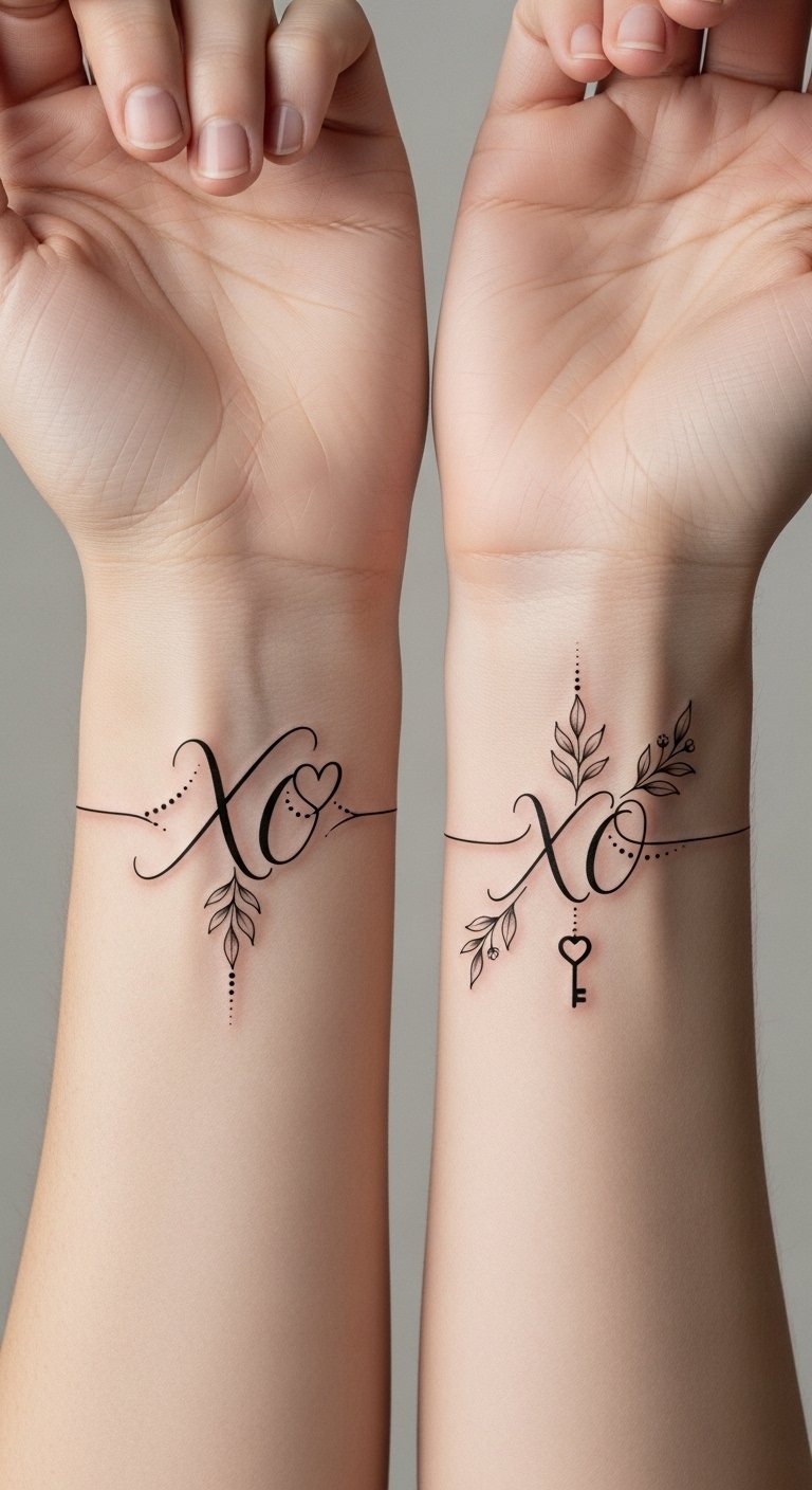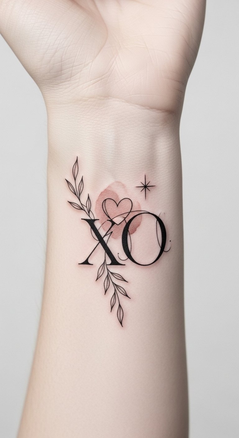 A delicate scripted XO rendered in flowing calligraphic strokes, with subtle flourishes and a small meaningful phrase tucked beneath in a complementary script; designed for placement on the inner wrist, collarbone, or behind the ear to allow intimate viewing.