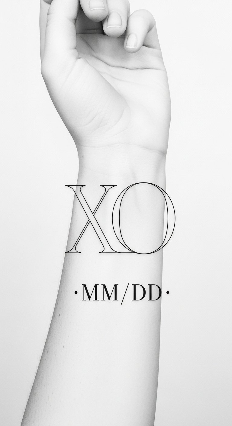 This concept blends the classic XO symbol with an entwined heart and a discreet date to convey enduring affection and personal history; the fine lines and soft watercolor accent express tenderness and vulnerability while the negative space keeps it intimate and understated. Emotionally it reads as a quiet promise or memento of a meaningful bond—suitable for couples or close friends who want a permanent, elegant reminder. Placement on the inner wrist offers visibility for personal reflection yet can be easily covered, making it both a public declaration and a private talisman.