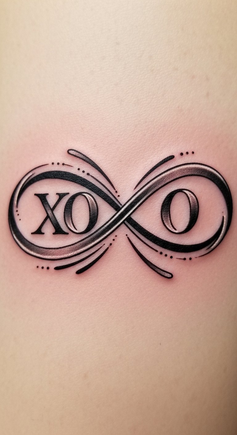 The design symbolically fuses XO (hugs and kisses) with the looping infinity to evoke unending affection and commitment; delicate, flowing lines can be inked small on the wrist, behind the ear, or along the collarbone for a personal touch, or scaled larger across the forearm or chest to make a bolder statement. Emotionally it conveys warmth, devotion, and freedom—choose fine black linework for subtlety, soft watercolor accents for romantic depth, or minimalist negative space for a modern, timeless placement that reads as both intimate and universal.