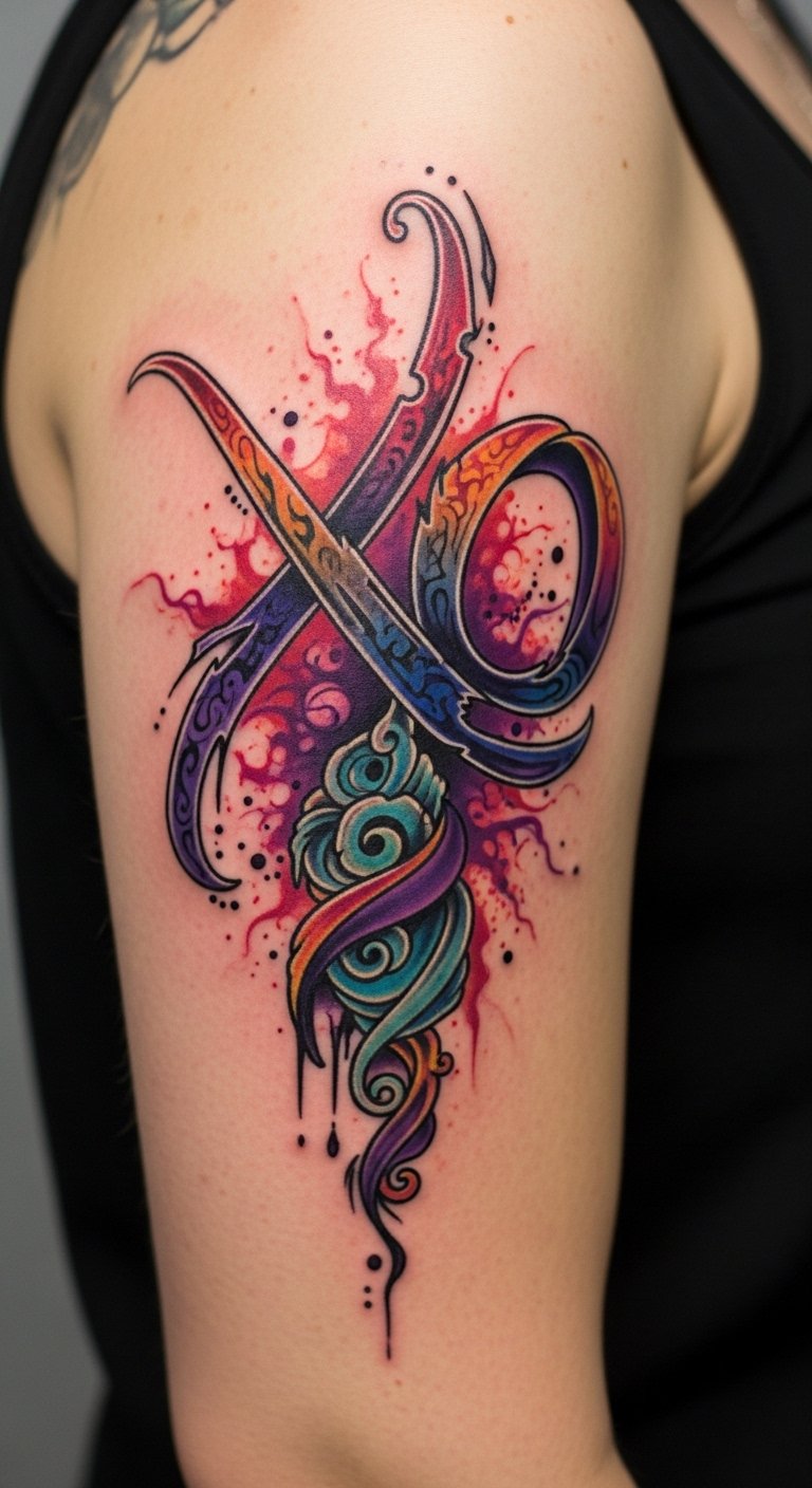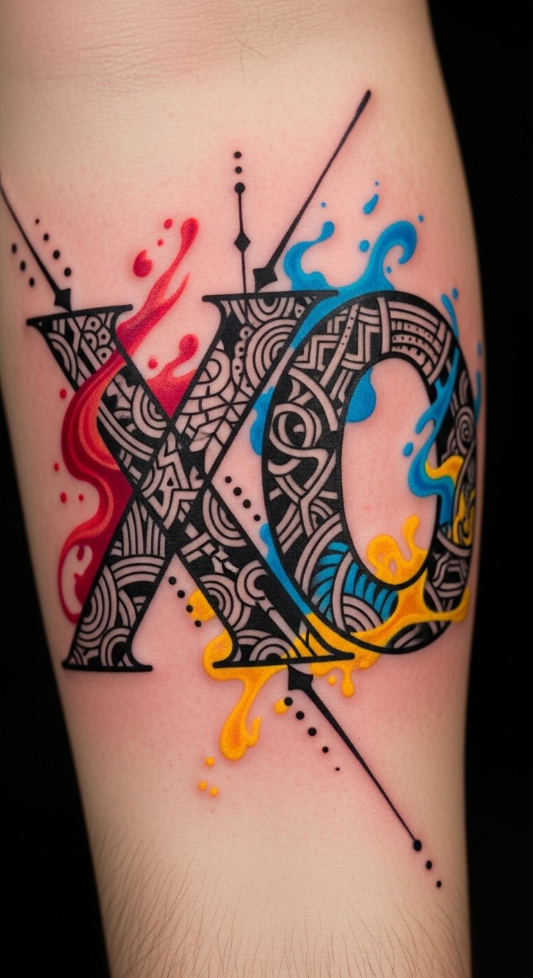 Integrate the bold XO as the central anchor—thick, solid black letters—surrounded by flowing color fields and geometric fragments that echo personal narratives: warm reds for passion, cool blues for calm, gold accents for treasured memories. Emotionally, the piece balances strength (the blackwork XO) with vulnerability and dynamism (the abstract additions), making it feel both intimate and striking. Ideal placements include the forearm or chest where the XO reads clearly and the surrounding abstraction can follow muscle lines; consider wrapping the color and shapes slightly around the wrist, ribcage, or shoulder to create movement and a sense of continuity with the body.
