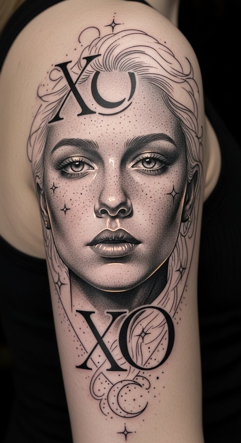 Building on the enchanting theme of celestial motifs, integrating an XO with portraits adds a deeply personal touch to your tattoo.