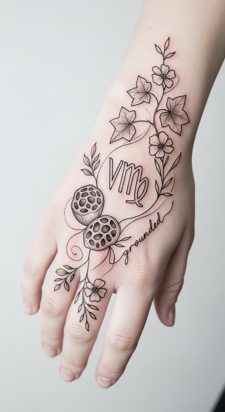 This design blends classic Virgo symbolism with earthy motifs to evoke steady, nurturing energy; seed pods and ivy suggest growth and resilience, wildflowers and fine dotwork emphasize quiet beauty and attention to detail, and the discreet cursive reinforces personal grounding.
