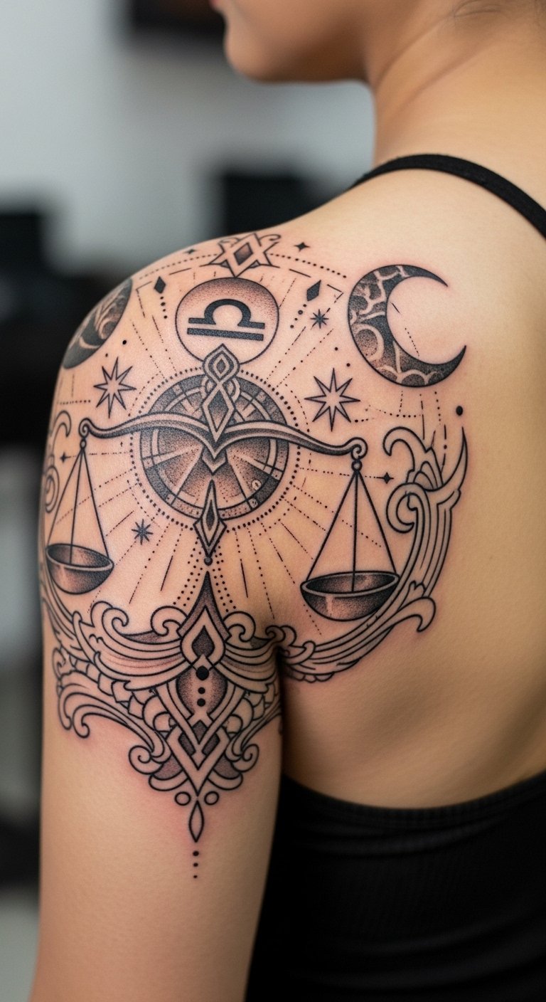 Libra’s scales sit at the heart of this piece, flanked by delicate laurel leaves and a crescent moon sprinkled with tiny stars to evoke celestial guidance; fine line work and soft dot shading keep the composition airy, while mirrored ornamental filigree ensures visual equilibrium.