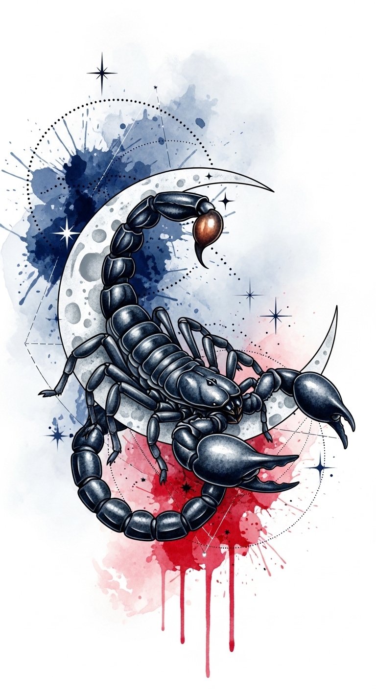 This design combines the scorpion’s fierce protection and transformative power with the moon’s hidden emotions; deep indigo and crimson convey passion and depth while watercolor splashes suggest fluidity and change. Fine dotwork stars and geometric lines add balance between chaos and control.