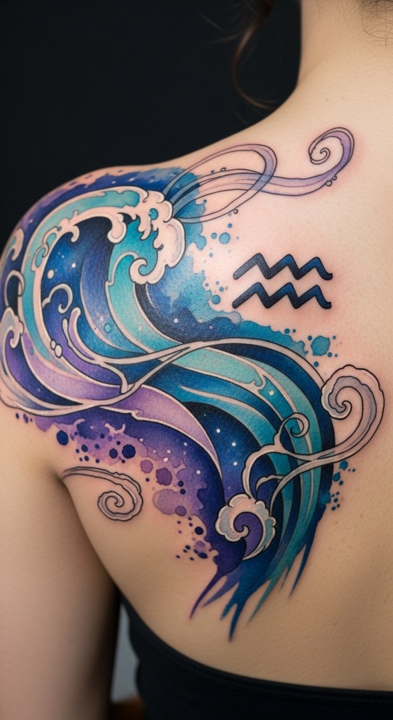 What makes Aquarius tattoos so enchanting is their embodiment of individuality and innovation. You’ll love the way creative watercolors swirl around Aquarius symbols, capturing cosmic waves that reflect your free spirit. These innovative designs, infused with the air element, speak to freedom concepts and unconventional styles. Perfect for showcasing unique placements, they resonate with your vibrant zodiac personality, setting you apart from the crowd.