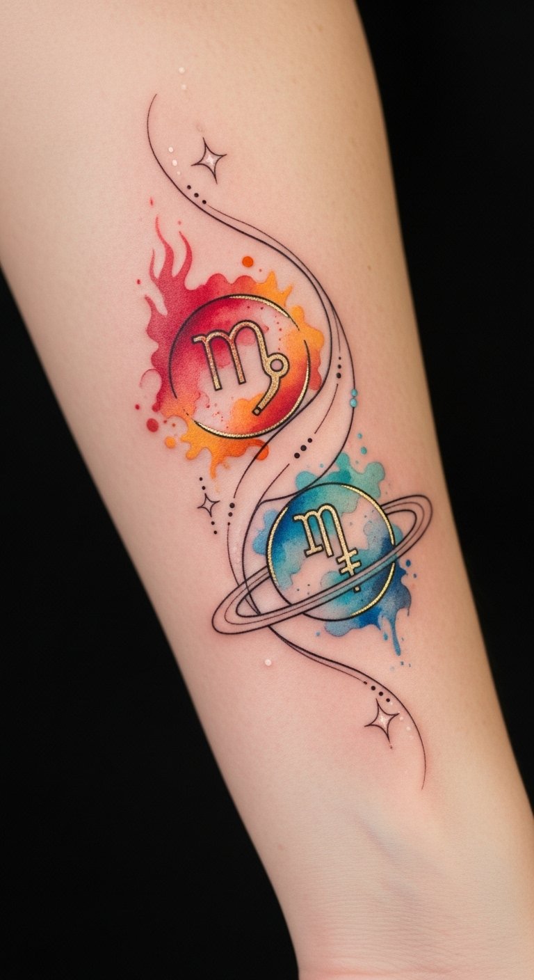 Feel the freedom in every hue! The design uses warm and cool washes to symbolize contrasting traits—passion versus intuition—while fine linework and gold accents elevate the celestial theme. Emotionally it reads as both personal and expressive, capturing identity and inner balance; ideal placement follows the forearm’s natural curve for visibility and flow, or mirrored on both wrists for symmetry.