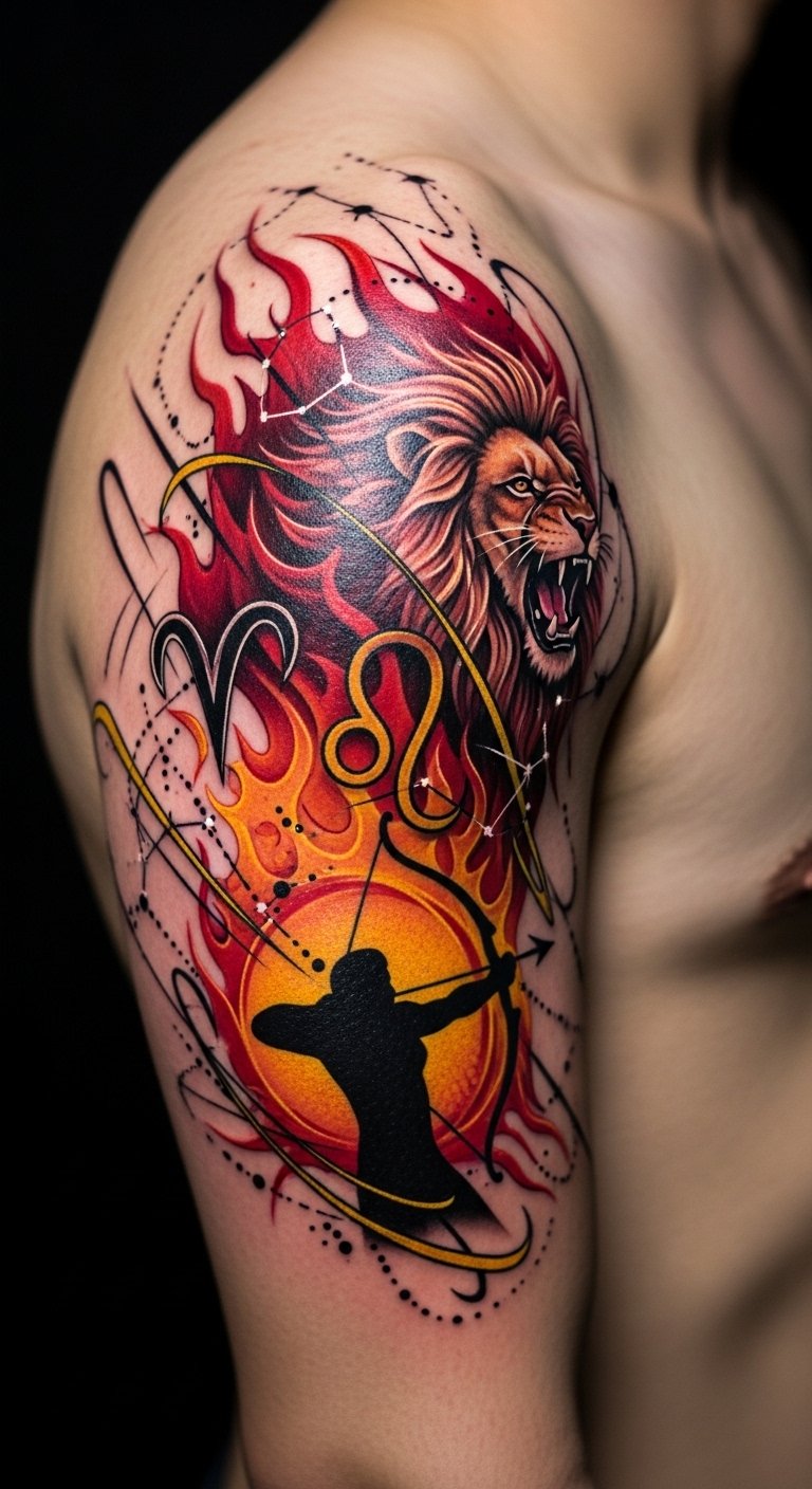 The symbolism blends courage, leadership, and exploration—flames for transformation, the lion for pride and strength, the archer for direction and adventure—evoking fierce emotion and momentum; ideal placements are upper arm or shoulder blade for visibility and movement, chest for personal significance, each allowing the design to read dynamically with the body’s contours.