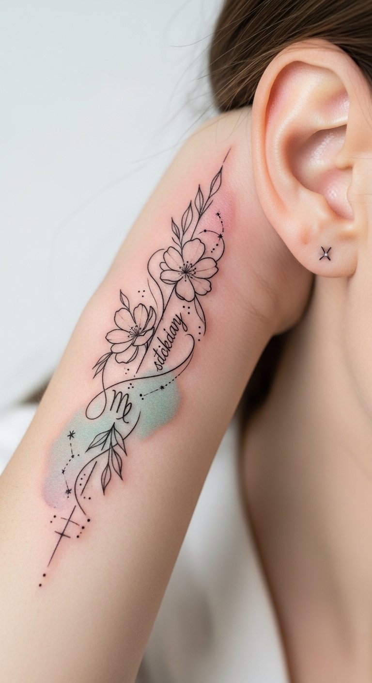 This design pairs your zodiac sign’s glyph or constellation with a wreath of seasonal flowers rendered in rich, saturated color and delicate linework, symbolizing personal growth, love, and passion while grounding celestial themes in earthly beauty; place it on the forearm or upper back to allow for a medium-sized, flowing composition that follows the body’s curves and evokes a sense of intimate connection between your life story and the cosmos.