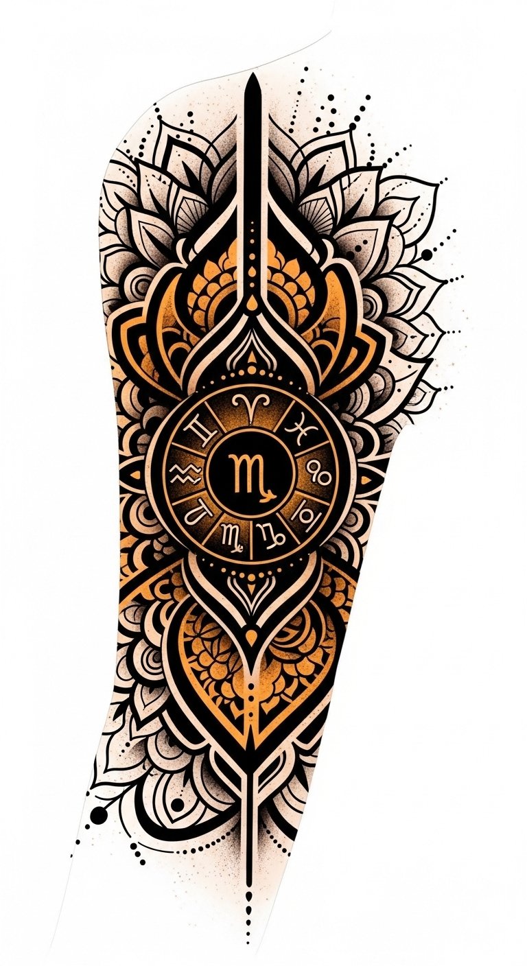 This design emphasizes regal power and fiery passion, evoking confidence and protection; ideal placement flows from upper forearm wrapping to shoulder or across the chest for a commanding presence, with the subtle zodiac glyph over the heart to personalize the emotional connection.