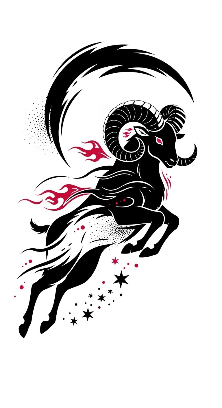 This tattoo concept channels that energy through bold lines and motion—horns forming a crescent to hug the forearm, flames and stars to emphasize fire and aspiration, and contrasting black with crimson to evoke intensity; ideal placement: outer forearm or shoulder where movement enhances the sense of charge and empowers the wearer with visible courage.