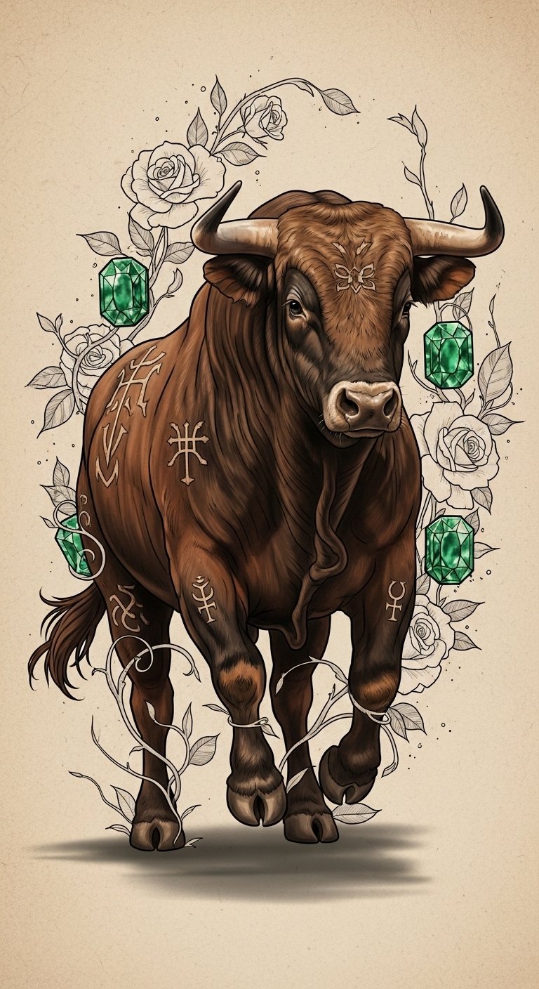 This design uses the bull as a central emblem of power, roses and emeralds weaving tenderness and value into the composition; the engraved sigils nod to mythic roots while fine botanical lines soften the image, evoking steady emotion and grounded resolve.