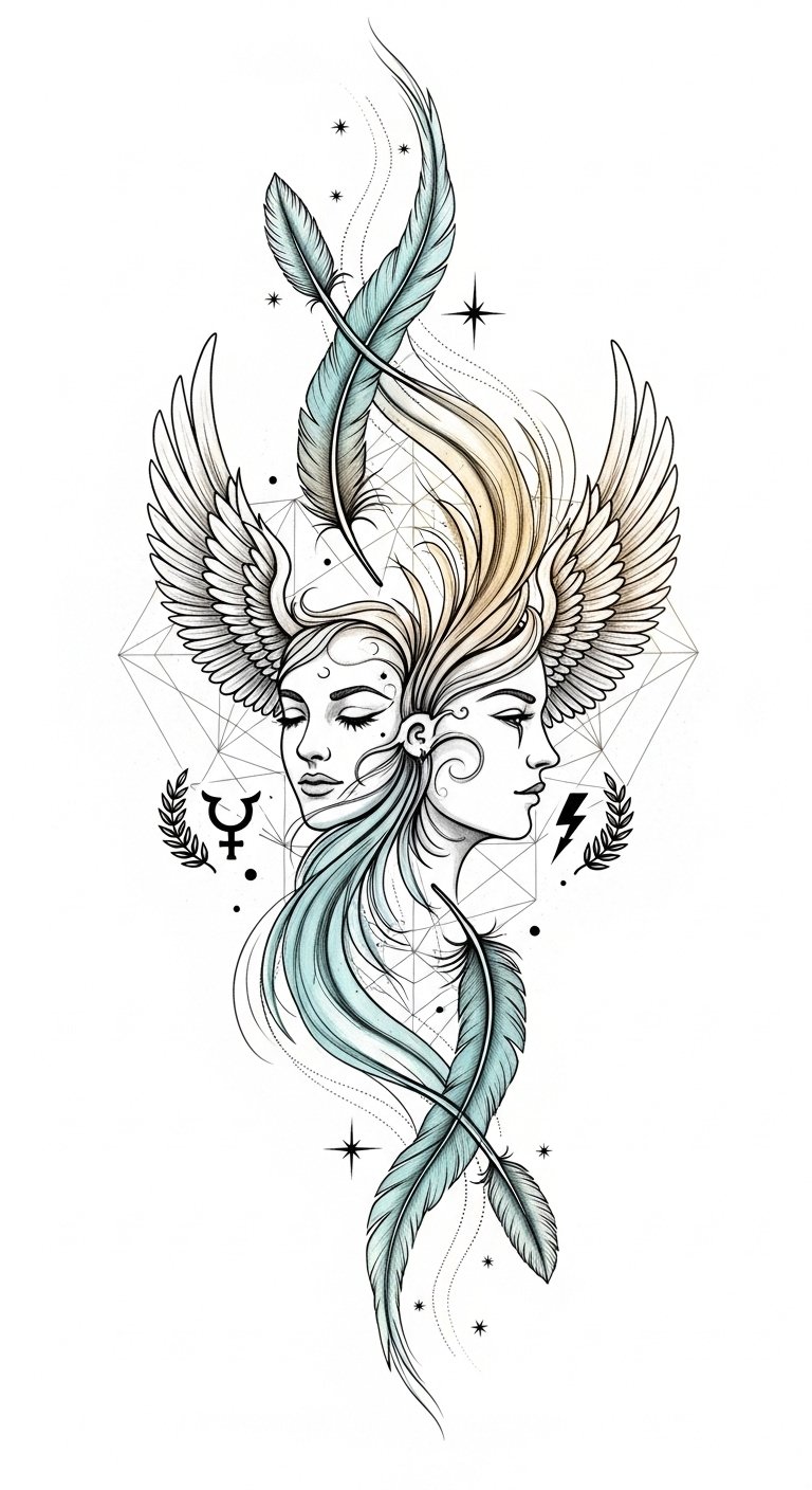 This design blends fluid motion and geometric structure to symbolize the balance between intuition and intellect; the luminous stream and constellation lines evoke cosmic guidance and forward-thinking. Circuitry hints nod to innovation, and the cool palette conveys calm clarity—ideal along the forearm for visibility and movement or the upper back for a larger, more contemplative canvas, provoking feelings of liberation and connection.