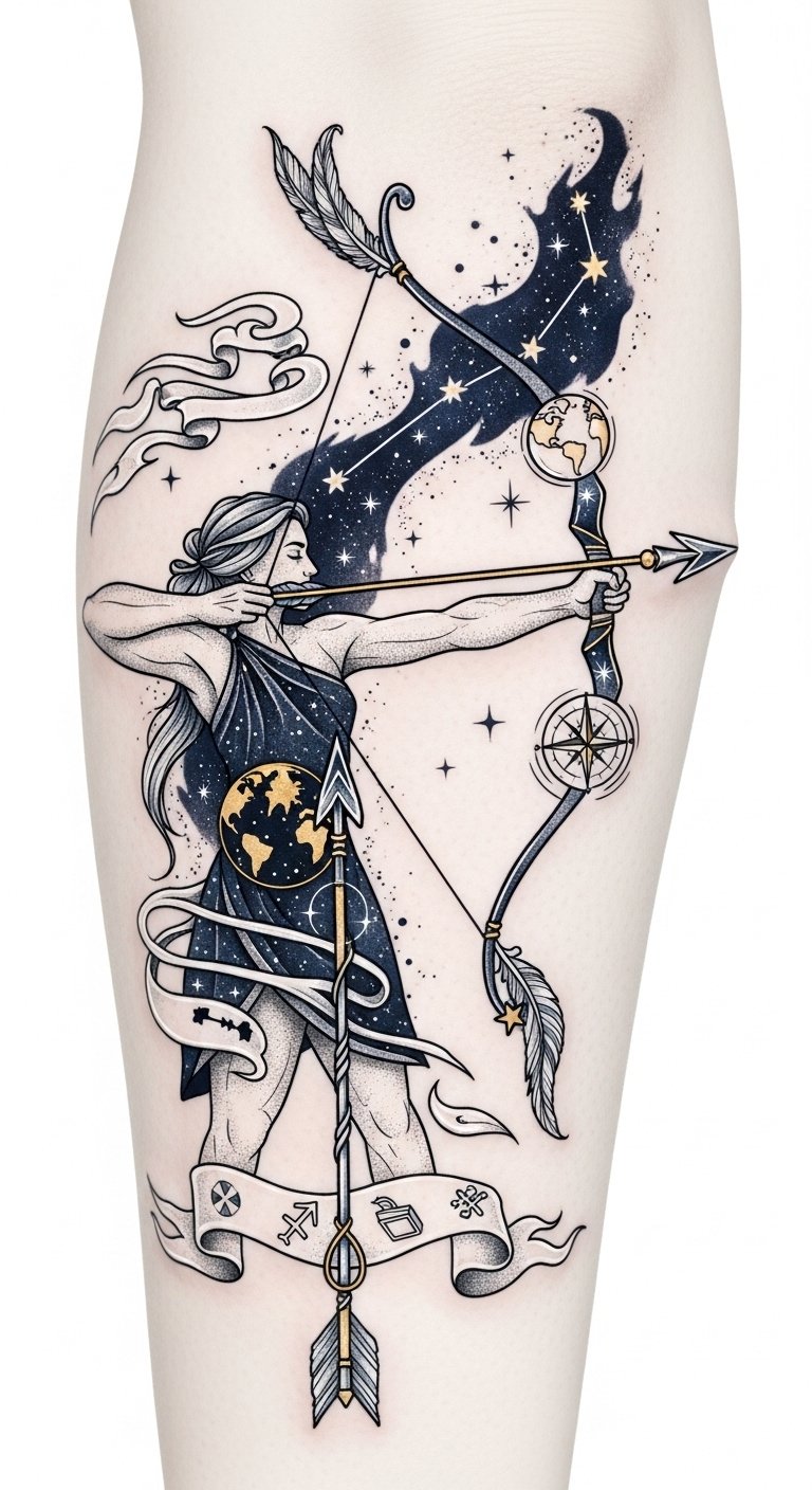 The tattoo concept merges literal and symbolic elements: the archer for courage and direction, the starry arrow for aspirations and destiny, the globe and compass for wanderlust, and wind/feather motifs for freedom; emotionally it evokes determination, optimism, and the urge for discovery.
